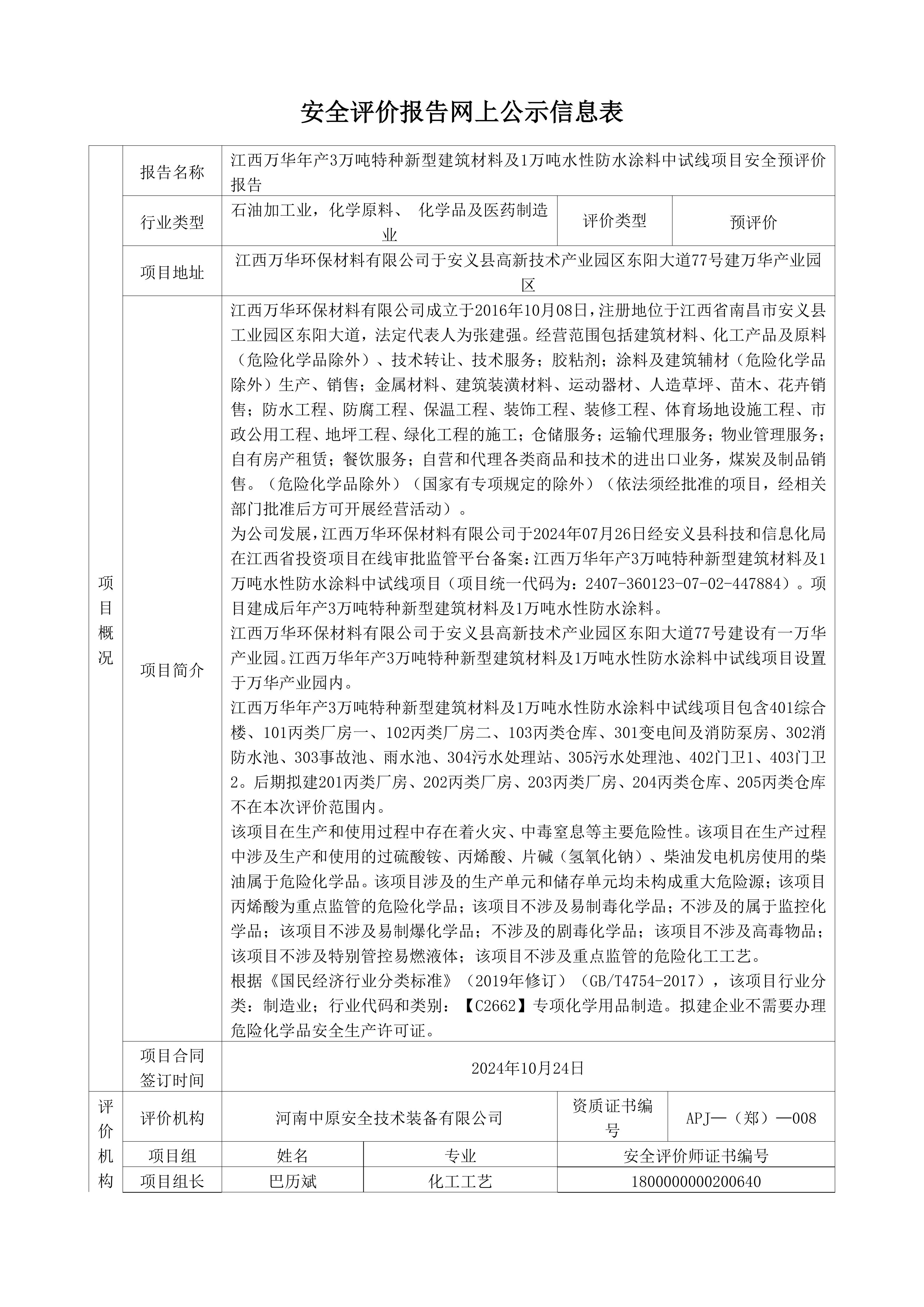 江西万华年产3万吨特种新型建筑材料及1万吨水性防水涂料中试线项目安全预评价报告